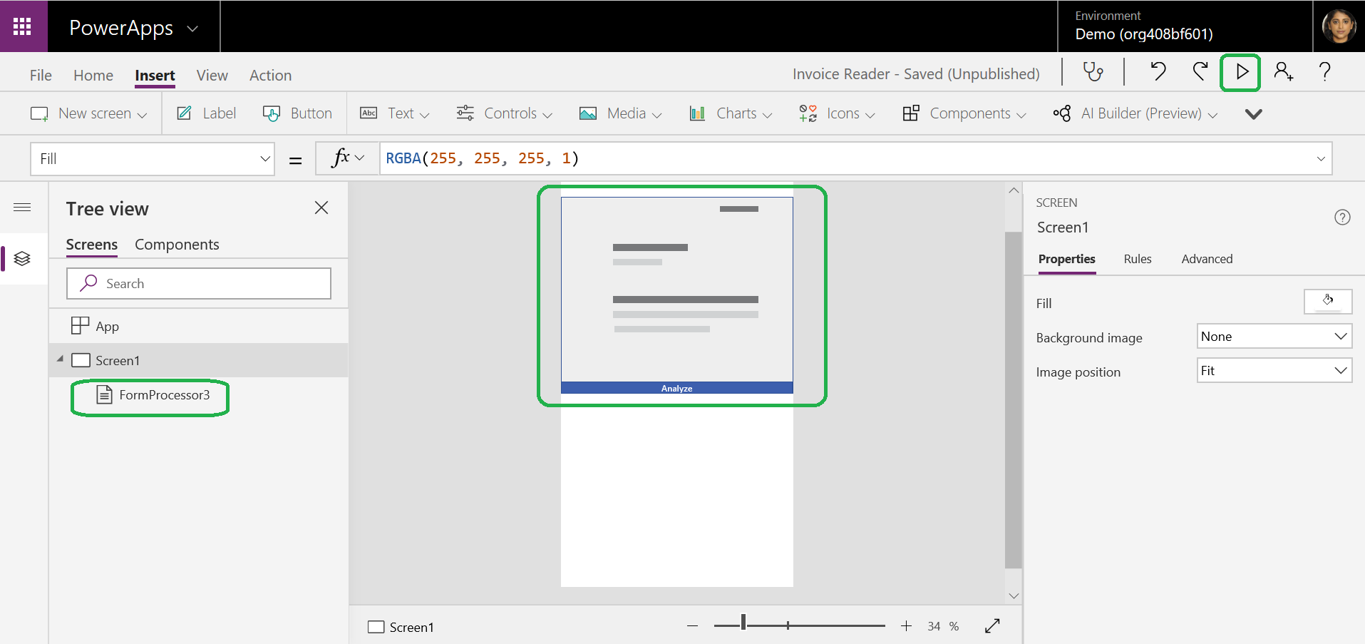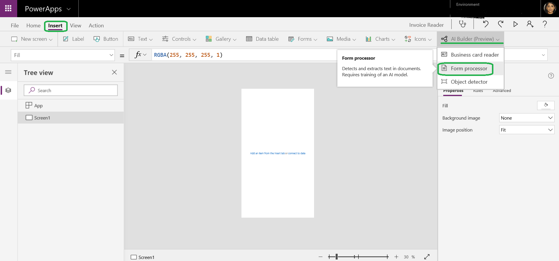 2. Navigate to Insert>AI Builder>FormProcessor