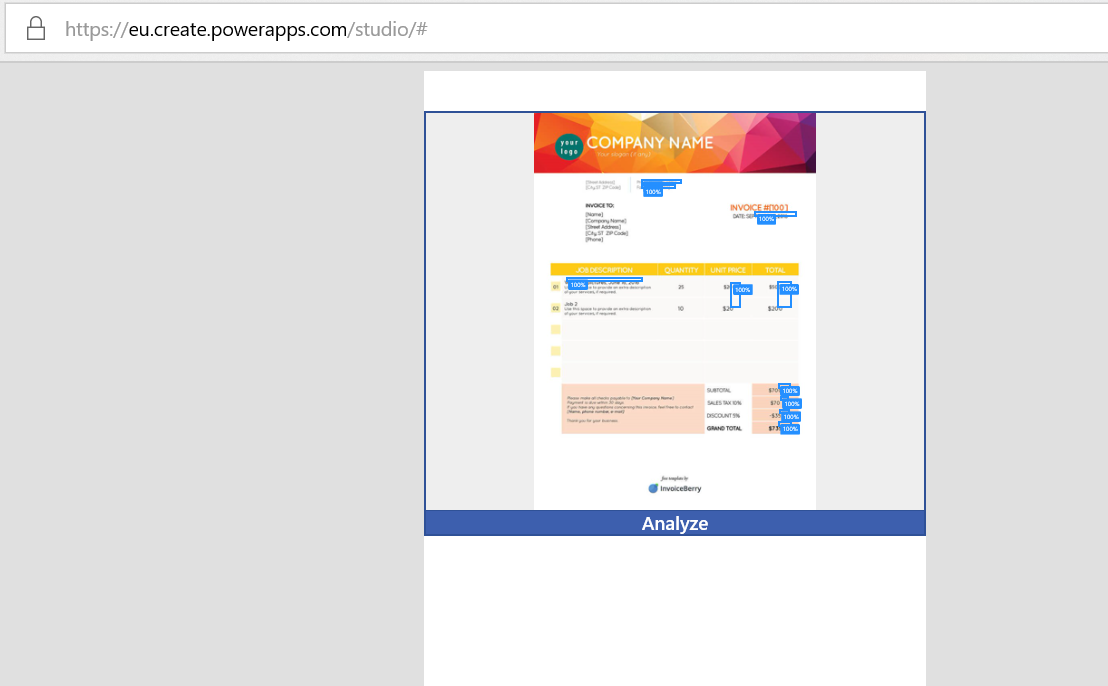 5. Click “Analyse” to add a new invoice that you wish to process. The app will identify the fields that we have trained the model for.
