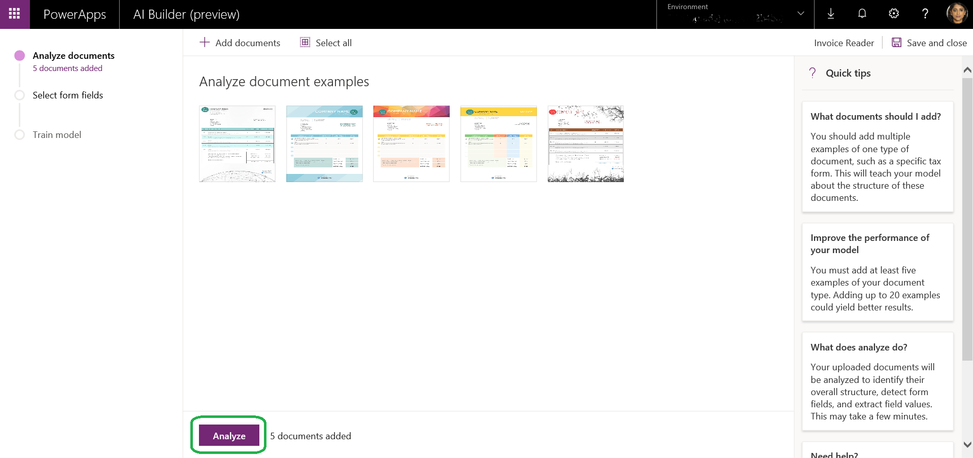 3. Analyse documents – Below screen shows the list of document for the model to Analyse. In this step the model will identify the data fields available on the document.