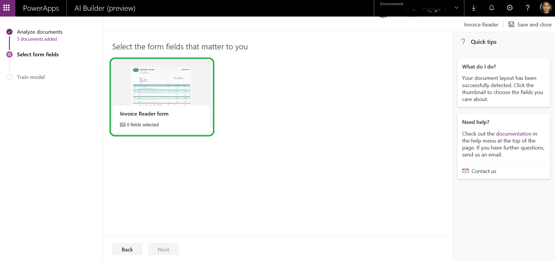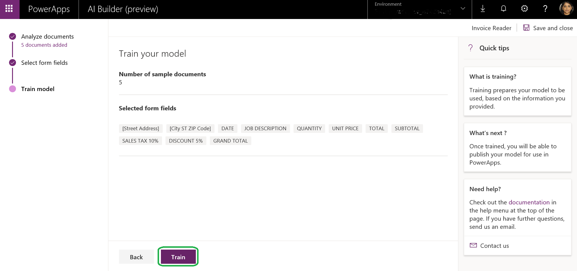 First, let us create a model using AI builder and train it with sample invoices. Next, we will be using this model in a Canvas App to process the images.