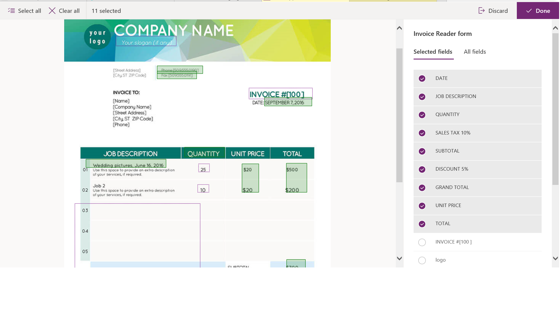 4. Select form fields – This step allows you to make a decision on what fields will be captured from the invoice to be processed in your system later. Click on the Image to select the fields.