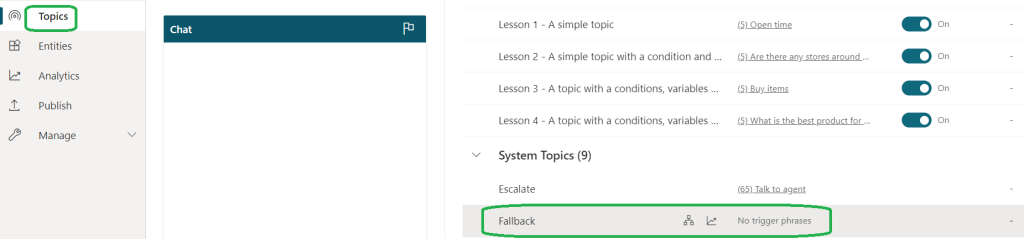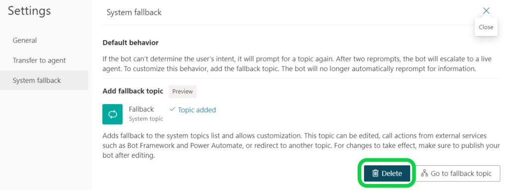 Note: Fallback is created as a system topic hence there is no option to turn off. You may wish to delete from the settings if no longer required.