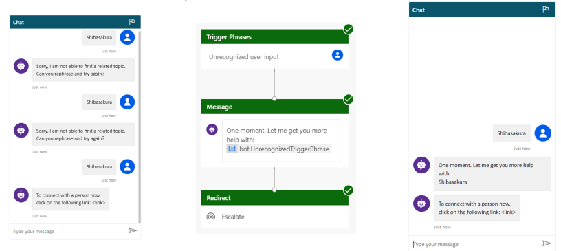 The Bot doesn’t understand the user utterance “Shibasakura”, and it asks the same question twice to the customer before escalating it.